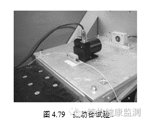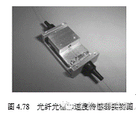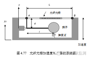 图4.77所示为该光纤光栅加速度传感器的原理图。传感器由L型的悬臂梁、质量块和弹簧构成。光纤光栅安装于A点与B点之间,并施加以预应力。这种结构使光纤光栅在其轴线上始终受均匀应力作用,避免了其反射峰的展宽,从而获得了较大的量程。使用弹簧片用以消除加速度传感器的横轴串扰问题。这种加速度传感器的自振频率为45Hz,测量精度为1pm/gal。图4.78为这种加速度传感器的实物图。