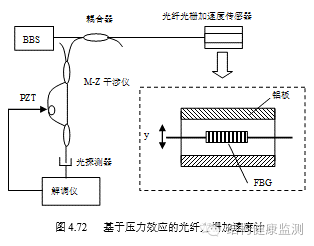 近年来,各国的科研人员开发了多种基于光纤光栅技术的加速度传感器。1996年,美国的Berkoff等人[53]利用光纤光栅的压力效应设计了光纤光栅振动加速度计。图4.72是其系统图,转换器由质量板、基板和符合材料组成,质量板和基板都是6mm厚的铝板,基板作为刚性板起支撑作用,中间为8mm厚的高性能橡胶夹在两铝板中间起弹簧的作用。在质量块的惯性力作用下,埋在复合材料中的光纤光栅受到横向力作用产生应变,从而导致光纤光栅的布拉格波长变化。采用非平衡M-Z干涉仪对光纤光栅的应变与加速度间的关系进行解调。此种方法设计的加速度传感器在振动过程中容易引起光纤的双折射,使反射谱的谱峰分裂,从而使测量精度降低,且容易受垂直于测量方向的振动的干扰。