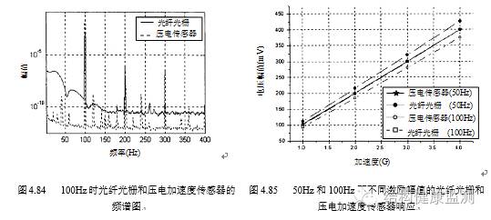 电磁振动台以不同频率的正弦波激励传感器。图5为100Hz时两种传感器的频谱图。可以看出光纤光栅加速度传感器的信噪比比较好。50Hz和100Hz时不同激励幅值的传感器响应如图6所示。随着激励幅值的增加,光纤光栅加速度传感器的响应也随之线性增大,与压电加速度传感器的响应基本一致。
