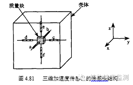 传感头结构如图4.81所示,图中,中间正方体为体积比较小的质量块,a、b、c、d、e、f为反射中心波长不同的光纤布拉格光栅(FBG)。每个光纤布拉格光栅两端分别接在体积很小的质量块和外部壳体上,在光纤光栅固定时,分别给每个FBG一个预紧力,并且使6个光纤光栅具有一定间隔的反射中心波长。