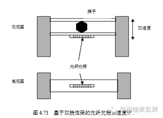 采用双挠性梁作为转换器设计了光栅加速度计。加速度传感器由两个矩形梁和一个质量块组成,质量块通过点接触焊接在两平行梁中间,光纤光栅贴在第二个矩形梁的下表面。在传感器受到振动时,在惯性力的作用下,质量块带动两个矩形梁振动使其产生应变,传递给光纤光栅引起波长移动。图4.73给出基于双挠性梁的光纤光栅加速度计。这种传感器降低了横轴串扰的问题,其横轴串扰误差仅为主轴方向的1%。但这种传感器的精度仅有212.5με/g,不能够满足土木建筑领域的需求。而且,由于粘接光纤光栅的悬臂梁其表面为非均匀变形,会导致布拉格反射峰平坦化,降低了测量精度。