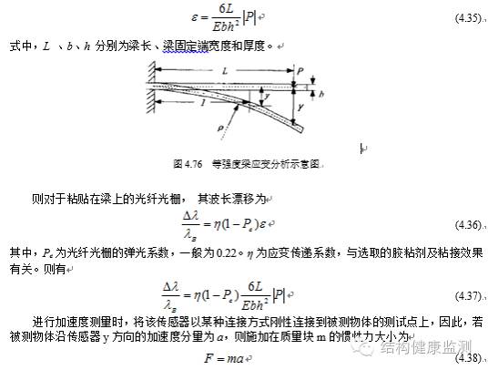 光纤光栅加速度传感器原理结构如图4.74所示。该传感器是由1个梁长为L的悬臂梁、1个质量为m的质量块以及相关的结构构成。采用回复性与弹性均较好的65#锰钢材料制作悬臂梁。根据弹性力学的原理,当悬臂梁自由端受垂直作用力,F而使梁发生弯曲时,悬臂梁将产生一个与施力方向相反的弹性回复力。因此,对于文献[56]所分析的无阻尼质量-弹簧系统的分析也同样适用于如图4.74所示的加速度传感器,其弹性系数k由悬臂梁的特性决定。