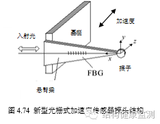 Mita[57]提出了一种新型的加速度传感器。该传感器包括一个悬臂梁和一个质量块。为了避免不均匀应变,光纤光栅没有直接粘贴在悬臂梁上,而是预拉伸后置于悬臂梁的上方。使用弹簧片用以消除加速度传感器的横轴串扰问题。这种加速度传感器的自振频率为45Hz,测量精度为1pm/gal。