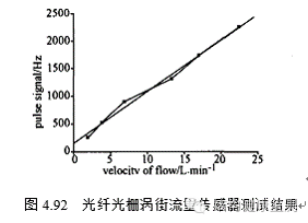 如图4.91所示为光纤光栅涡街流量传感器测试原理框图,宽带光源发出的光经3dB耦合器进入光纤光栅流量传感器,返回的信号光与高双折射光纤环镜发生卷积作用[67],经过PIN光电二极管转换为电信号并滤波放大后,由计算机通过AD采集卡(DAQ2010)采集进入计算机进行信号处理与显示。测试中,将光纤光栅流量传感器安装于动态容积法液体流量标准装置中,根据流量传感器的流量范围,选择了6个流量点。如图5所示为系统的测试结果图,横轴为液体流量标准装置所示流量,纵轴为采集到的信号脉冲数频率。由图可以看出,拟合曲线为Qv=93.226×f+149.688,线性度误差0.42%,故该流量传感器具有很好的线性度,测量精度达到±0.59%F.S.。