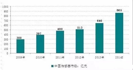 近年来,国内传感器市场持续快速增长,年均增长速度超过20%,2011年传感器市场规模为480亿元,2012年达到513亿元,2013年达到640亿元,2014年则超过800亿元。