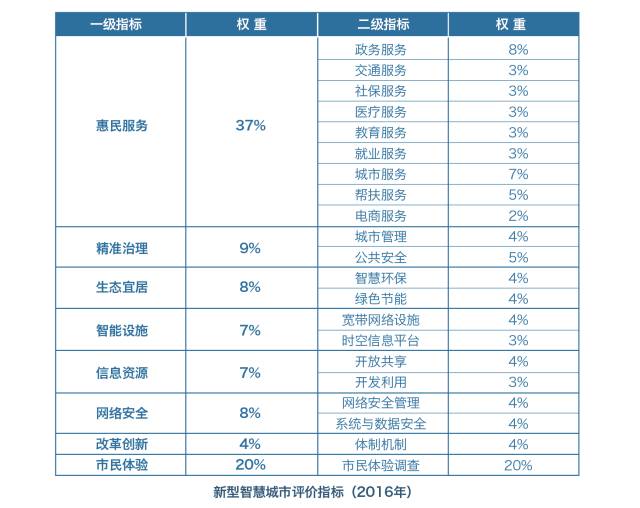 在笔者看来,这一指标体系首次将“存在感”提升到了最高的地位,为什么这么说呢?因为虽然从内容上看该评价指标体系包括惠民服务、精准治理、生态宜居、产业经济、基础设施、网络安全、体制机制创新、市民体验等一级指标和若干个二级指标,但其中惠民服务占比37%,市民体验占比20%,两者权重超过50%,惠民服务和市民体验不正是“存在感”的最好体现。而智能设施、网络安全等需要进行大规模硬件投入的领域所占的权重并不高,这也是对《国家智慧城市试点2015年度工作报告》所提到的 “重硬件投入而轻市民参与”问题最好的回应。